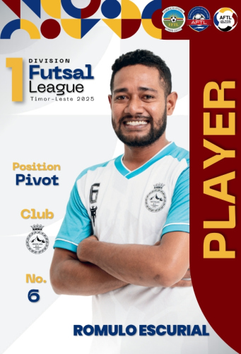 4. Rivaldo Faria Ribeiro6. Romulo Escurial7. João Caetano De Sousa Guterres7. Inocencio Espirito S. Leite11. Evinho M. B. A. Do Rego Guterres13. Ivan J. S. Patrocinio Antonino14. Silveiro Da R. Da S. Gárcia17. Luis Francisco Ferreira18. Zonzinho N. M. V. B. Boerman19. Joel Baptista Canizio Fernandes20. Bernabe Da C. Soares21. Jose Rodrigues Da Costa24. Domingos Gama25. Benny Francisco G. M. Ribeiro26. Natalizio Imanuel Sang27. Luis Noveilo G. Soares28. Expedito De Araujo29. Carlos Manuel Da Silva30. João Paul Canizio De Sousa55. Pedro Maia De Carvalho NameRomulo EscurialNationalityEast TimorPositionPivotCurrent TeamRAMELAU F.CLeagues1st DivisionSeasons2025